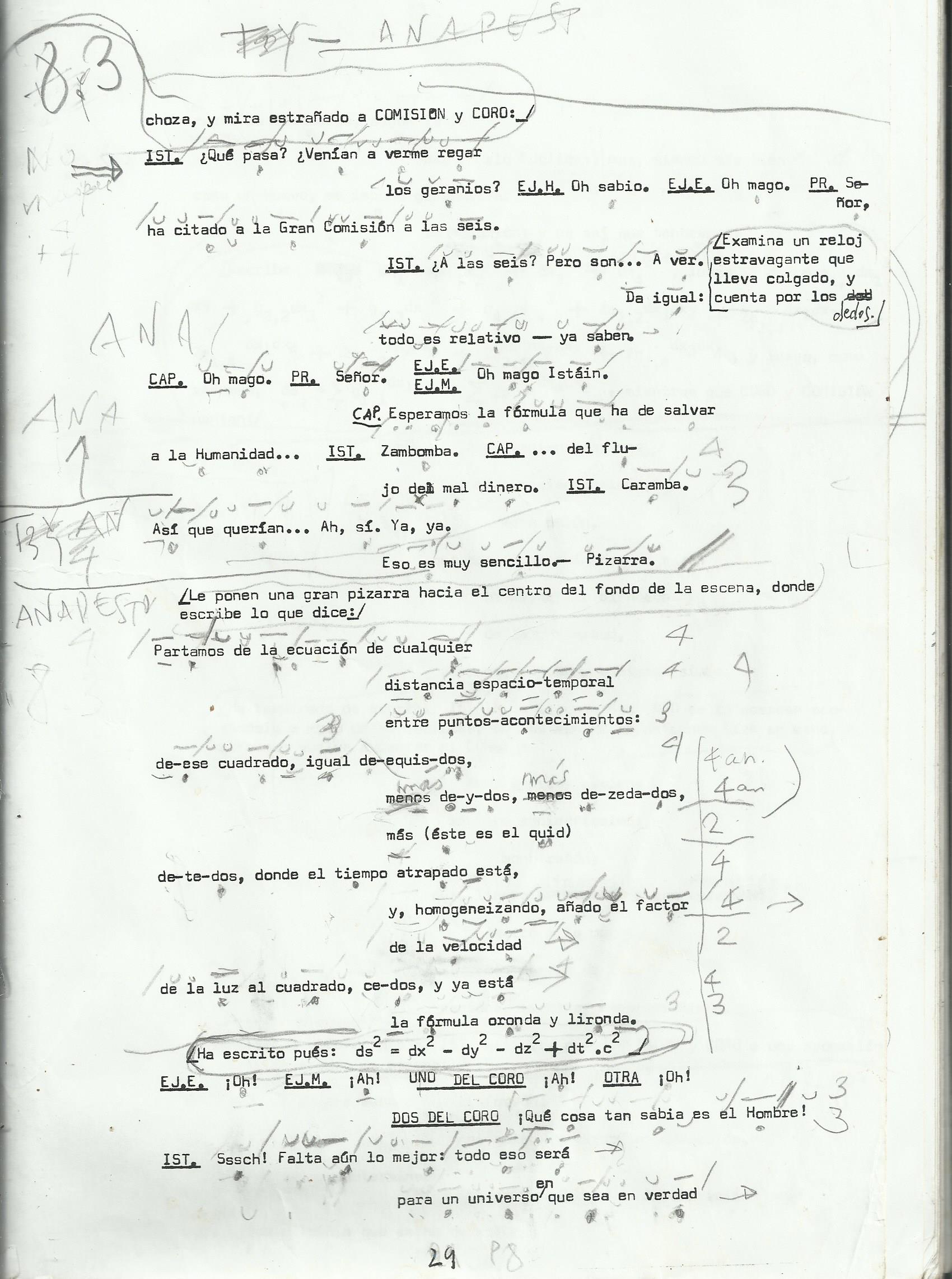 Recordemos que en ambas páginas tenemos un metro de 8 anapestos divididos por un cesura o pequeña pausa en dos mitades, llamadas hemistiquios, de 4. Se escribe cada primera mitad pegada al margen izquierdo, y cada segunda mitad pegada al margen derecho. Así se percibe visualmente en qué instante rítmico de este largo verso nos encontramos. En la segunda pagina, para el fragmento que comienza 'Partamos de la ecuación...' se explica en el prólogo su métrica, Pág.. 16-17, en una nomenclatura que, precisamente por su exactitud en la medidas de cada sílaba dentro del pie, resulta --nos resulta-- farragosa de seguir, salvo en la preparación de la lectura.