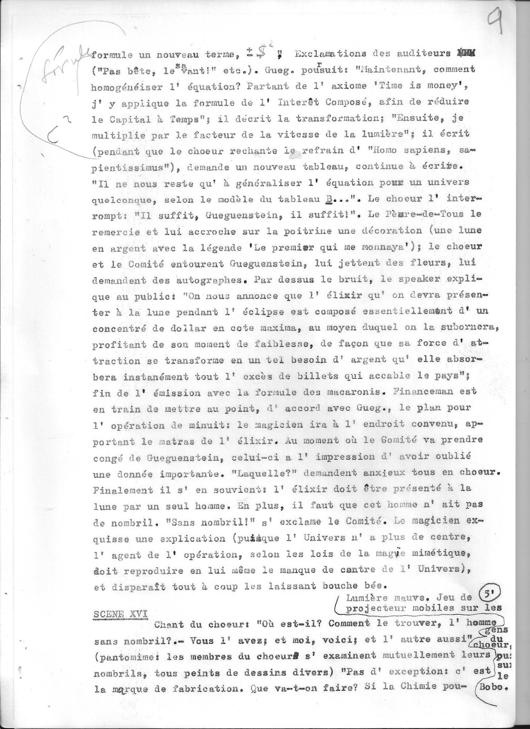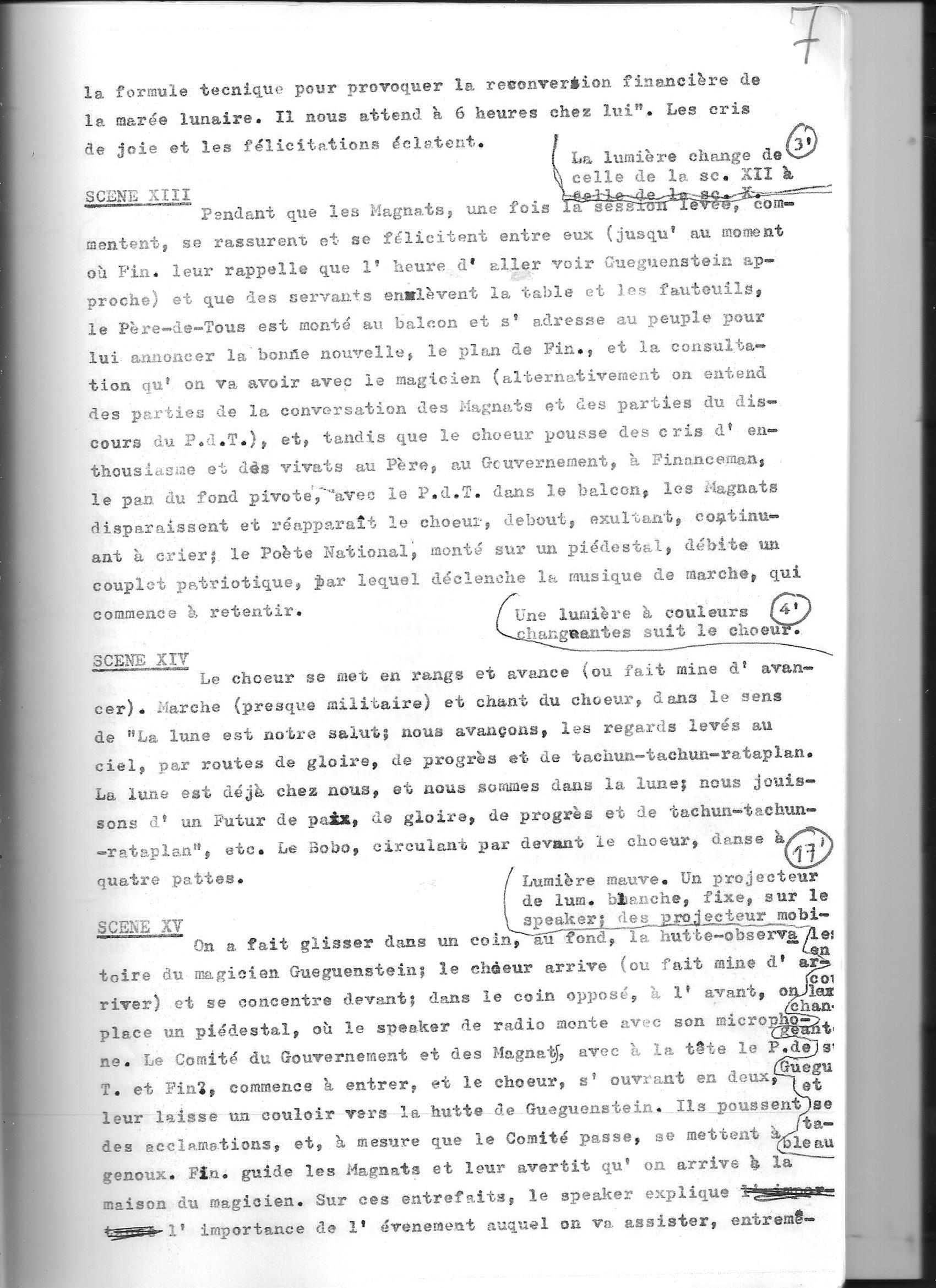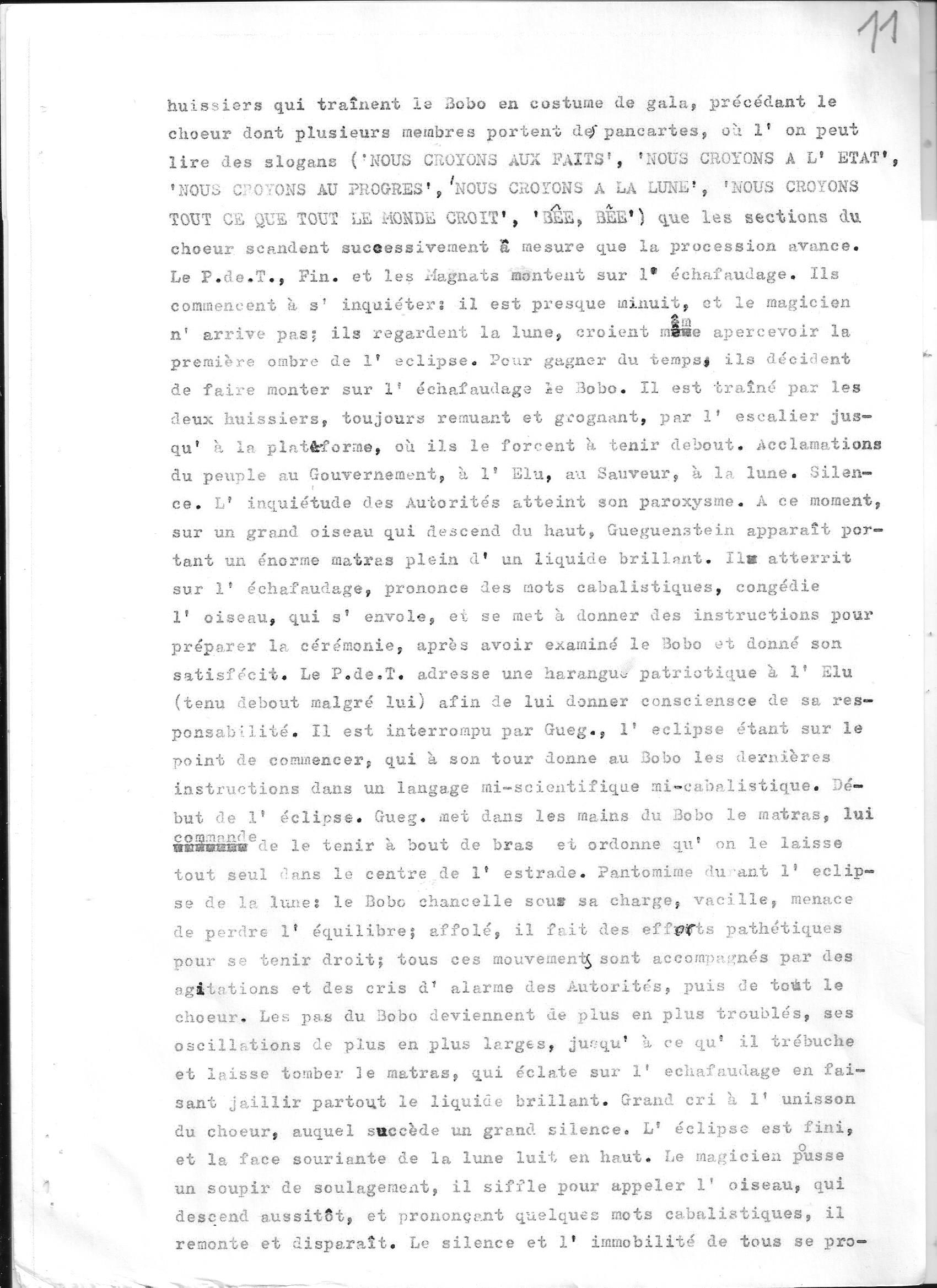 El siguiente texto (en francés), muy poco conocido, lo escribió AGC durante su estancia en París. Es un texto importante para la mejor comprensión de Bobomundo, porque describe minuciosamente las circunstancias de la escenografía --nada sencilla-- de la obra. Puntualiza en él los tiempos de la acción, las luces diferentes ligadas a esos tiempos, el movimiento de actores, aunque estos quedan descritos en el texto del libreto como apartes. La diferencia entre ambos textos radica en que las acotaciones en la obra son breves informaciones para el lector, mientras que en el presente texto se trata de informaciones precisas momento a momento, como en un guión de cine, aunque sin los diálogos, que están en el libreto. Es material profesional, para el director, el escenógrafo, el estudioso y los actores.