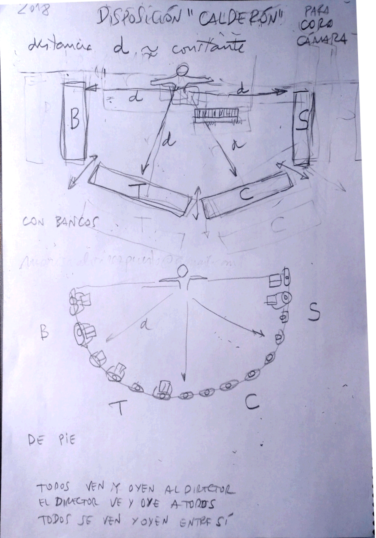 Disposición circular del coro (perteneciente a Canto Coral)Siempre estuve convencido de que esta disposición es la única sensata. Y ello desde que comprobé una y mil veces que apenas se oye a una persona que canta de espaldas a nosotros. Si no se hace así la comunicación visual y la atención e centran en el director --cosa muy necesaria, desde luego-- pero así cada cuerda se aisla de las demás --auditiva y visualmente-- sufriendo la música. afinación, empaste, gesto.... Todo. Y no de adezca (?) que sí se oye, porque se oye en el ensayo. Claro que se oye... si se ensaya en una sal con techo bajo, e incluso con pated enfrente del coro. En ese caso disponenmos de abundante sonidoreflejado que tranquiliza a todos en ese aspecto. LO que pasa es que omo las salas de concierto no ienen pared enfrente ( es la 'cuarta pared del teatro, el púbjico) y el techo con frecuencia está alto, alto. Y lo mismo en las iglesias: unas con acustica buen (cúpula encima del coro) otras desastrosa. Otro lugar.