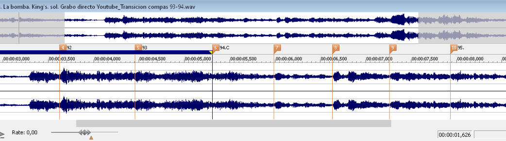 en | yen - do_a- Je | -rú - saaaaaaa | - len ¡San-ta Vi-gen de Lo - ree-toooooooo | San Gi -nés! Midiendo la duración de la parte (la negra) en el 3:4 (tres por cuatro) obtenemos medio segundo, 500 milisegundos. El compás dura pues 1500 ms. La parte (negra en el compasillo, dura más o menos la mitad del compás anterior, negra con puntillo, como se ve y oye en el compás 92.