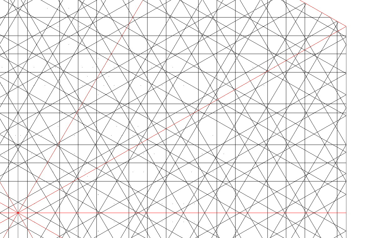 Se observa que los puntos de reflejo en el la pared vertical se espacian diferentemente. A veces coi9nciden los de series (ángulos) diferentes) a veces no. Cabe preguntarse sobre la repercusión estética de esta distribución de puntos de reflejo, en el segmento vertical y en los demás. Incluso, al observar los círculos aparentes que aparecen dentro del triángulo EGR, que no son otra cosa que puntos de simetría radial mayor o menor, completa o incompleta, tenemos que preguntarnos sobre la elección de distancias, de las SS X y H, siempre dentro de la periodicidad elegida (recordamos que no es indispensable, cabe perfectamente una red no periódica, que se expande más u más hacia la periferia, sin bloques de desplazamiento.