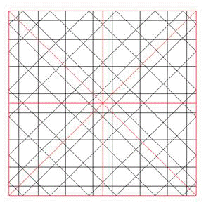 Nótese como siempre el 'reflejo' aparente de todas las rectas de la red en los límites y ejes de simetría, en rojo, que aseguran la prolongación correcta de la red interior en el exterior, hasta el infinito.