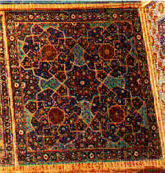The pattern presented in figs. 3-3, 3-4 is hidden by the foreground Rige, and has been reconstructed by applying the parsimony laws stated before, in a kind of geometric logic based on simplicity. In fact this pattern can still be seen under the foreground, distorted by color changes. The centers of 8 pointed stars are important references: all the vertices of foreground Rige are situated on them; in our reconstruction, therefore, in those centres, little figures - not really belonging to the pattern - have been added to guide the eye and help the design.