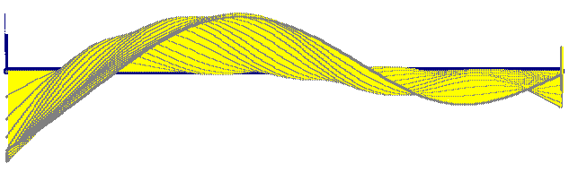 Golpe a 23% del extremo, mostrando forma casi inicial y primeros parciales con sus amplitudes y frecuencias. Nótese que estas formas de la tabla en los primeros momentos del golpe se obtienen exclusivamente sumando los parciales de la tabla en proporción igual a su elongación --ordenada de la tabla-- en ese punto, y con dirección inicial de movimiento igual a la del golpe, y posición inicial en reposo --todos los parciales nulos en el momento del impacto: és decir, como se describe en los puntos 1 a 4 anteriores.